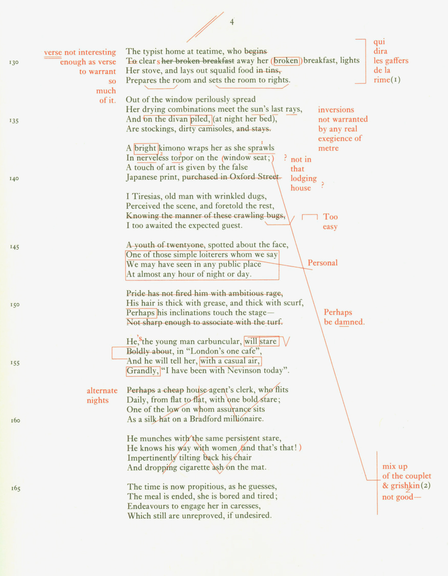 பாரிஸில் அவரும் பவுண்டும் ஒவ்வொரு பக்கமாக, ஒவ்வொரு பகுதியாக கவிதையை வாசித்துத் திருத்தியிருந்தார்கள் என்றால் அது வடிவ அமைப்பு ஒன்றை அதனின்று மீட்பதற்கல்ல, மாறாக, செயற்கைத்தன்மை கொண்ட பகுதிகளிலிருந்து மெய்ம்மையுள்ள அடிகளைக் கண்டெடுக்க முயற்சித்திருந்தனர். தங்கள் அண்மையிலிருந்தவற்றை நீக்கினாலும் பொருள் தரக்கூடிய ஒற்றை அடிகளாகக் கவிதையை உருவாக்கிய பல்வேறு நியோகிளாசிக்கல் இலக்கணங்களால் இந்தச் செயற்கைத்தன்மை நெறிப்படுத்தப்பட்டிருந்தது.