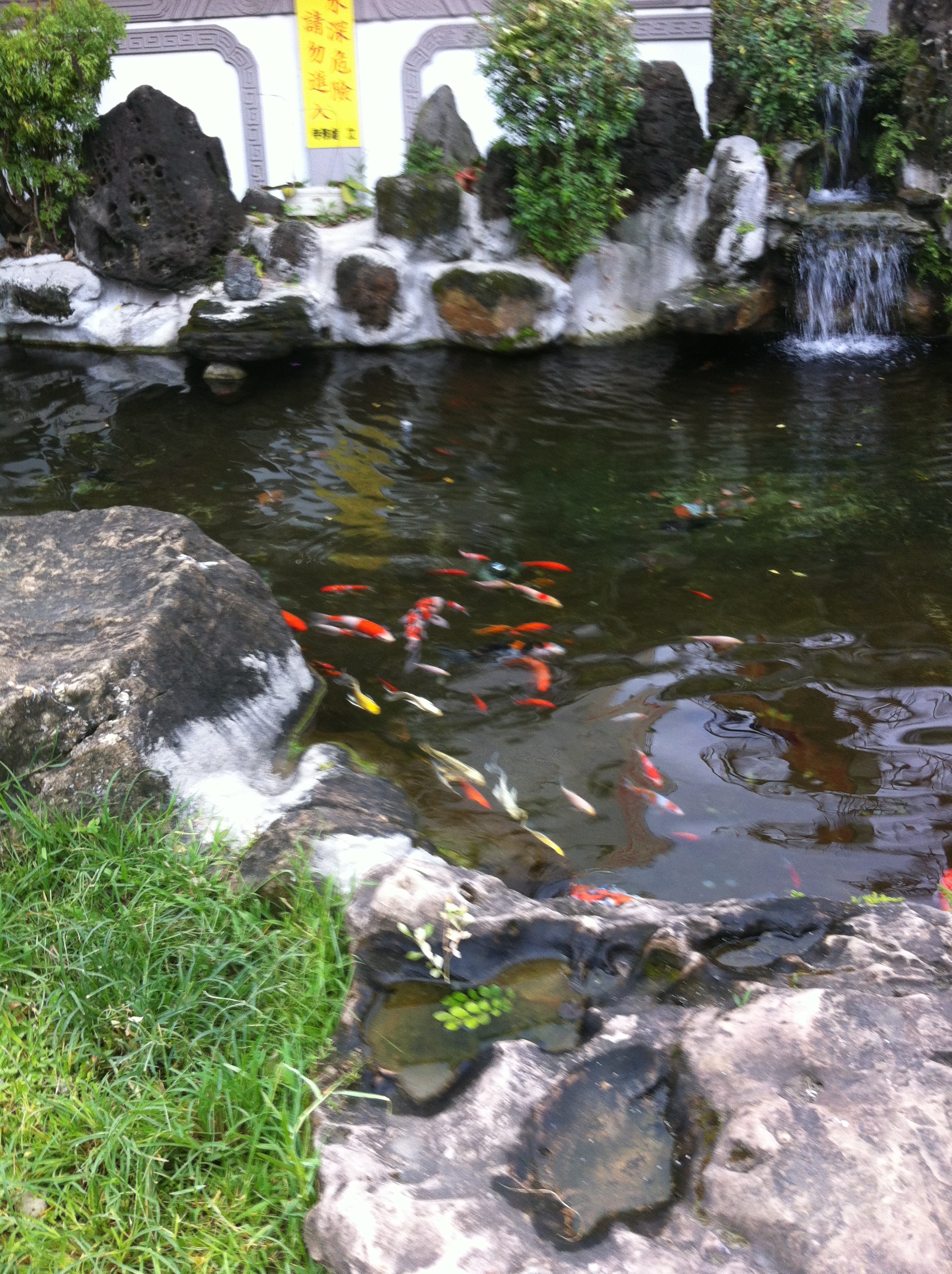 புத்தர் சிலையின் எதிரே ஒரு சிறு செயற்கை ஓடை அமைக்கப்பட்டிருந்தது. பாறைகள் பதிக்கப்பட்டு அவ்விடத்தில் உட்கார்ந்து நீர் நிலையைப் பார்க்க வசதி செய்யப்பட்டிருந்தது. சில நிமிடங்கள் அங்கே அமர்ந்திருந்தேன். ஆரஞ்சு நிறத்திலும் வெள்ளை நிறத்திலும் மீன்கள் சிறியதும் பெரியதுமாக நீந்திக் கொண்டிருந்தன. பாறையில் என் கால்களைத் தொங்கப் போட்டு உட்கார்ந்திருந்ததால் எல்லா மீன்களும் என் காலுக்கு கீழே நீந்தின. பின்னர் நான் எழுந்து இன்னொரு பாறைக்குப் பின்னால் நின்றபோது அந்த மீன்கூட்டம் அதே பாறை முன்னால் வந்து நீந்தின. பழக்கமா? நான் பொரியோ அல்லது உணவோ போடுவேன் என்ற எதிர்பார்ப்பா?
