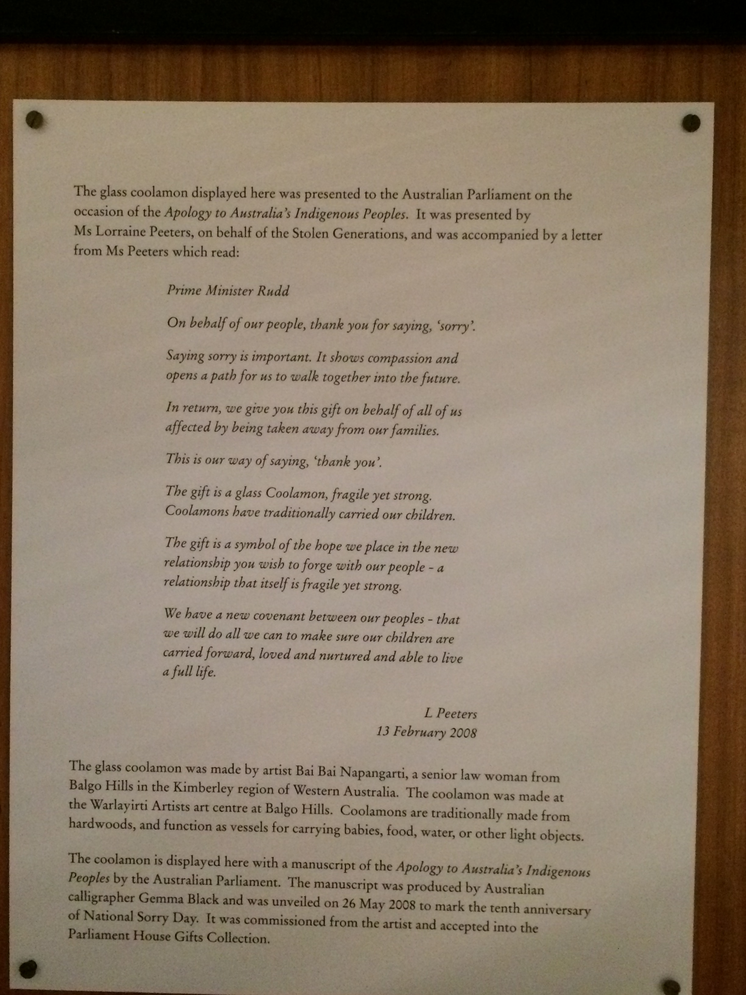 சென்ற வருடம் டிசம்பரில் கான்பெர்ரா பாராளுமன்றத்துக்குச் சென்றிருந்தபோது அங்கே பார்வைக்கு வைக்கப்பட்டிருந்த, அரசாங்கம் நிறைவேற்றிய மன்னிப்புக் கடிதத்தைப் படித்தேன். அதன் அருகேயே அந்த மன்னிப்பை ஏற்றுக் கொண்டு பூர்வகுடியினரின் பிரதிநிதிகள் எழுதிய கடிதமும் இருந்தது. அந்தக் கடிதத்தோடு சேர்த்து, மன்னிப்பை ஏற்றுக்கொண்டதன் அடையாளமாக பூர்வகுடிகள் பயன்படுத்திய ஒரு பொருளையும் அவர்கள் அரசாங்கத்துக்குக் கொடுத்திருந்தார்கள்.